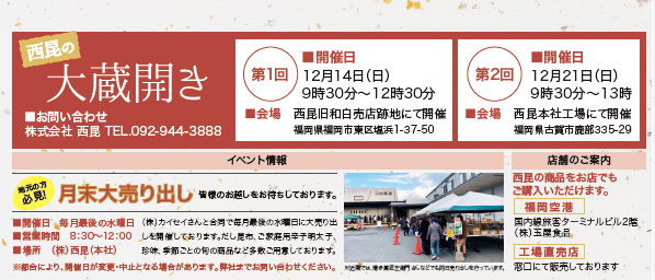 - 2025年“蔵開き”のご案内 今年もやります!年内最後の大売り出し大蔵開き開催!!【和白会場】12/14(日) 09:30〜12:30 【古賀会場】12/21(日) 09:30〜13:00 皆様のご来場従業員一同心よりお待ちしております!!