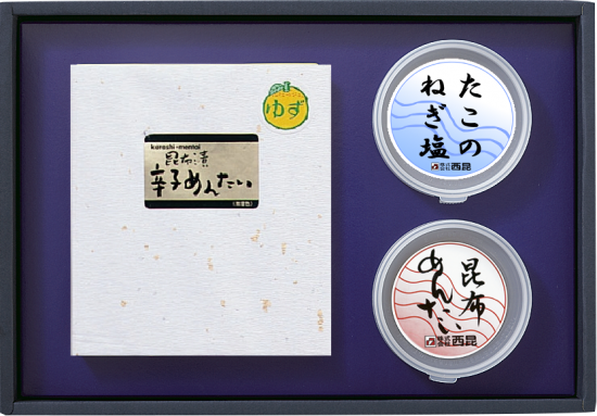 昆布漬辛子明太子(ゆず風味)と和えもの2種類のセットです。 西昆オリジナルの箱に入れてお届けいたします。