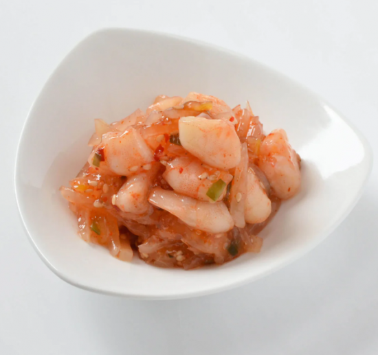 大根(国産)、調味えび(バナメイえび、砂糖、しょう油、食塩、醸造酢)、還元水飴、にんにく風味調味液(還元水飴、醸造酢、食塩、その他)、にら、しょう油、キムチ調味料(唐辛子、食塩、砂糖・異性化液糖、にんにく、その他)、白ごま、砂糖、ゆず皮、食塩、昆布エキス、唐辛子、醸造酢/調味料(アミノ酸等)、ソルビトール、酒精、酸味料、増粘多糖類、香料、pH調整剤、酵素、着色料(パプリカ色素)、酸化防止剤(亜硫酸Na)、(一部にえび・小麦・ごま・大豆・りんごを含む)
